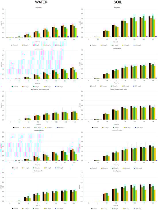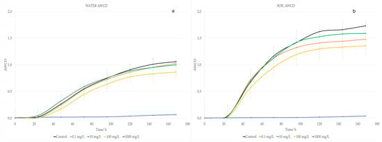 A similar effect as the one found in water was observed for the soil sample (Figure 2b) when AWCD was plotted versus a period of 168 h. From 24 to 168 h, statistical differences between the control and 1000 mg/L were found (p < 0.01). However, at 168 h, the AWCD values between the control group and the dose of 100 mg/L were also significantly different.