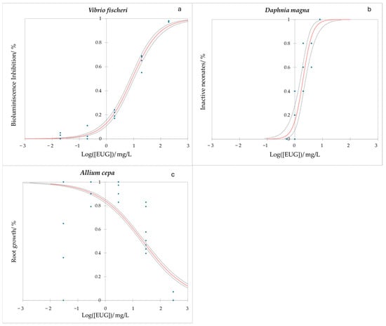 Dose–response curve for the (a) bioluminescence assay for Vibrio fischeri after 30 min exposure to eugenol (curves are the average of 4 replicates); (b) Daphnia magna test after 24 h exposure to eugenol (curves are the average of 5 replicates); and (c) Allium cepa test after 72 h exposure to eugenol (curves are the average of 12 replicates). Red line is the model, blue dots are experimental data, and dashed lines are the inferior and superior confidence limits (95%).