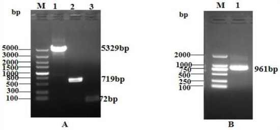 Agarose gel electrophoresis analysis of the linearized pQE80-KAN vector, GFP gene, and TEV site LRGG gene sequences confirmed that their fragment lengths were 5329 bp, 719 bp, and 72 bp, respectively (Figure 1A). PCR identification of the transformed competent clones using the primers pQE30+ and pQE30− revealed the expected band size of 961 bp for the GFP + LRGG + TEV restriction sites, as shown in Figure 1B. These results validated the successful construction of the prokaryotic expression vector pQE-GFP-LRGG.
