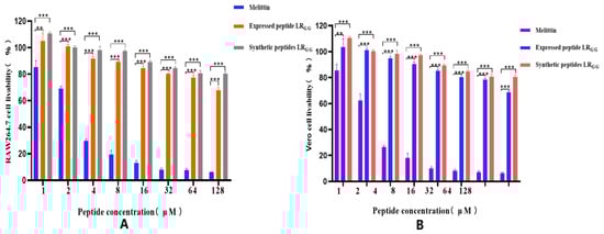 Cytotoxicity of the expressed peptide LRGG and the synthetic peptide LRGG to RAW264.7 (A) and Vero (B) cells. Note: *** p < 0.001 indicates a very significant difference, ** p < 0.01 indicates a very significant difference.