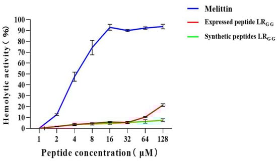 The effectiveness of the expressed and synthetic peptides LRGG against RAW264.7 and Vero cell was evaluated, as demonstrated in Figure 4). At MIC values of 1–64, the chemically synthesized antimicrobial peptide exhibited a slightly higher cell survival rate compared to the prokaryotic-expressed antimicrobial peptide. However, both the expressed and synthetic peptides showed over 80% cell survival rate against RAW264.7 and Vero cells, in contrast to the control melittin. Compared with that of the melittin control, the hemolytic activity of chemically synthesized LRGG was less than 10% compared to the melittin control at MIC values of 1–64 μg/mL, as shown in Figure 5. The hemolytic activity of the expressed LRGG was slightly more than 10% at 64 μg/mL, but the hemolytic index was less than 10% at the lowest inhibitory concentration. When the MIC value is 128 μg/mL, the hemolytic activity of the expressed LRGG is slightly higher than 20%, which may have slight toxicity [37]. The comparable cytotoxicity and hemolytic activity of LRGG-expressed and chemically synthesized LRGG demonstrated that the antimicrobial peptide LRGG has excellent cell selectivity at minimum inhibitory concentrations.