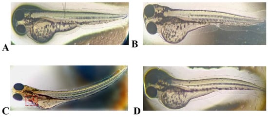 Embryonic safety of the expressed peptide LRGG and the synthetic peptide LRGG in zebrafish. (A) Negative control containing culture medium; (B) Containing 1 × Expression peptide LRGG at MIC concentration; (C) Containing 200 μg/mL sodium dehydroacetate; (D) Containing 1 × MIC of the Chemical Synthesis Peptide LRGG.