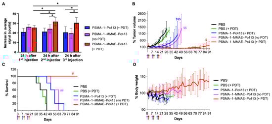 2.4. PSMA-1-MMAE-Pc413 with PDT Demonstrated Synergistic Antitumor Activity In Vivo