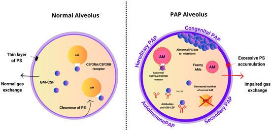 Pulmonary surfactant (PS) is a complex consisting of polar phospholipids: dipalmitoylphosphatidylcholine (DPPC) (40%), other phospholipids (40%), and cholesterol (10%) and surfactant proteins A–D (10%). The function of PS is to prevent alveolar collapse by decreasing surface tension and protecting the lungs from infections and inflammation, acting as an opsonin as well as directly killing microbes, being an important part of host defense against microbial pathogens. PS is secreted and degraded by lung alveolar type-II (AT-II) cells, although around 30% of the surfactant is catabolized by alveolar macrophages (AMs). The balance between production and clearance enables the maintenance of surfactant homeostasis and is pivotal for the functioning of the complex [12,13]. In PAP, the alteration of surfactant homeostasis results in an accumulation of lipoproteinaceous material in pulmonary alveoli and AMs (Figure 1) [14].