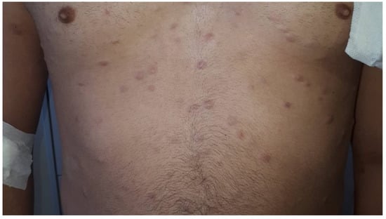 - Yoshioka, K.; Kurokawa, R.; Amemiya, S.; Koyamaa, H.; Matsuda, K.; Honda, A.; Kurokawa, M.; Shinozaki-Ushiku, A.; Abe, O. Rapidly progressing blastic plasmacytoid dendritic cell neoplasm causing diffuse skin thickening: A case report with sequential computed tomography examinations. Radiol. Case Rep. 2021, 16, 2929–2933. [Google Scholar] [CrossRef] [PubMed]
