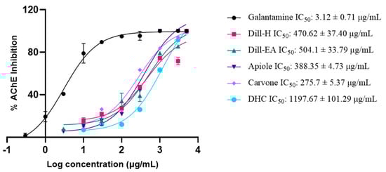 IC50 curves of dill extracts, apiole, carvone, and DHC with inhibitor control (galantamine) against AChE (Electrophorus). The IC50 values were calculated using GraphPad Prism 10. The values were expressed as a mean of three experiments ± SEM.
