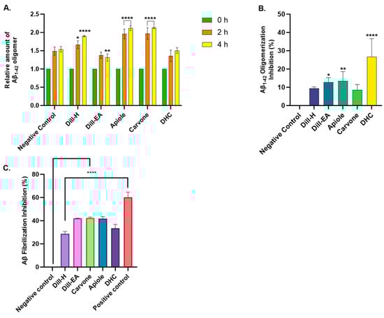 The multimeric detection system (MDS) was used to investigate the effect of dill on Aβ oligomerization. The results were calculated based on the zero h value at which all samples and control signals were set at 1.0. The oligomerization reduction at 2 h was statistically significant in dill-H (* p < 0.05), and apiole and carvone (**** p < 0.0001). A non-significant oligomerization reduction was observed in dill-EA and DHC. After 4 h of incubation, a statistically significant oligomerization reduction (*** p < 0.0001) was observed in the case of dill-H, apiole, and carvone except for dill-EA (* p < 0.01) (Figure 3A). The compounds may inhibit Aβ oligomerization at different times due to structural differences affecting their interaction with the protein. Additionally, the compounds may degrade with time [].