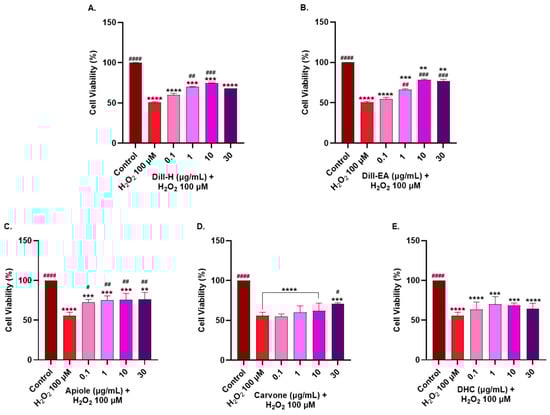 Neuroprotective effects of (A) dill-H, (B) dill-EA, (C) apiole, (D) carvone, and (E) DHC in H2O2-induced neuroblastoma SH-SY5Y cells at 0.1, 1, 10, and 30 µg/mL. The SH-SY5Y cells were preincubated with the extracts for 12 h, followed by 1 h of H2O2 (100 µM) treatment. The results indicate % cell viability vs. the control cells mean ± SEM (n = 3). A significant difference # (p < 0.05), **/## (p < 0.01), ***/### (p < 0.001) and ****/#### (p < 0.0001), using one-way ANOVA followed by Dunnett’s test, was observed in the % of cell viability vs. untreated cells (*) and H2O2 treated cells (#).