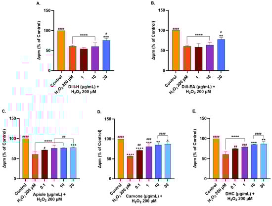 Mitochondrial membrane potential in SH-SY5Y cells pre-treated with (A) dill-H, (B) dill-EA, (C) apiole, (D) carvone, and (E) DHC followed by 200 μM H2O2 treatment for 2 h. The results indicate % ∆Ψm vs. the control cells (untreated cells). Values are mean ± SEM (n = 3). The data were analyzed by one-way ANOVA followed by Dunnett’s test. A significant difference */# (p < 0.05), **/## (p < 0.01), ***/### (p < 0.001), and ****/#### (p < 0.0001) was observed in the % cell viability vs. untreated cells (*) and H2O2 treated cells (#).