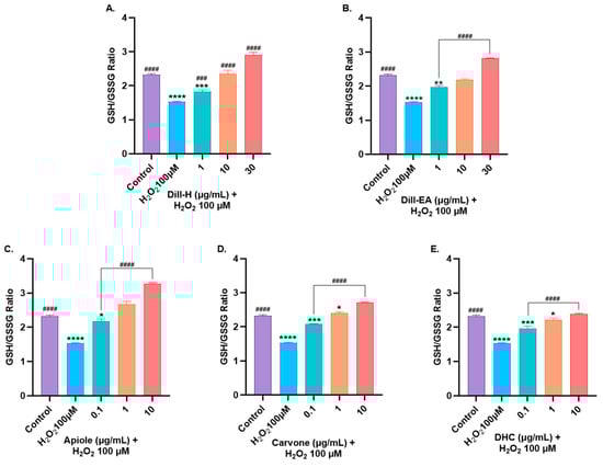 GSH/GSSG ratio in SH-SY5Y cell lysate exposed to 100 μM H2O2 for 6 h after 24 h of pre-treatment with (A) dill-H, (B) dill-EA, (C) apiole, (D) carvone, and (E) DHC. The results indicate the GSH/GSSG ratio in treated and control cells (untreated cells). Values are mean ± SEM (n = 3). The data were analyzed by one-way ANOVA followed by Dunnett’s test. A significant difference of * (p < 0.05), ** (p < 0.01), ***/### (p < 0.001), and ****/#### (p < 0.0001), was observed in comparison to untreated cells (*) and H2O2 treated cells (#).