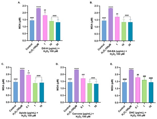 Malondialdehyde (MDA) content in SH-SY5Y cells lysate exposed to 100 μM H2O2 for 6 h after 24 h pre-treatment with (A) dill-H, (B) dill-EA, (C) apiole, (D) carvone, and (E) DHC. The results indicate MDA (μM) in treated and control cells (untreated cells). Values are mean ± SEM (n = 3). The data were analyzed by one-way ANOVA followed by Dunnett’s test. A significant difference */# (p < 0.05, **/## (p < 0.01), ### (p < 0.001), and ****/#### (p < 0.0001) was observed in comparison to untreated cells (*) and H2O2 treated (#) cells.