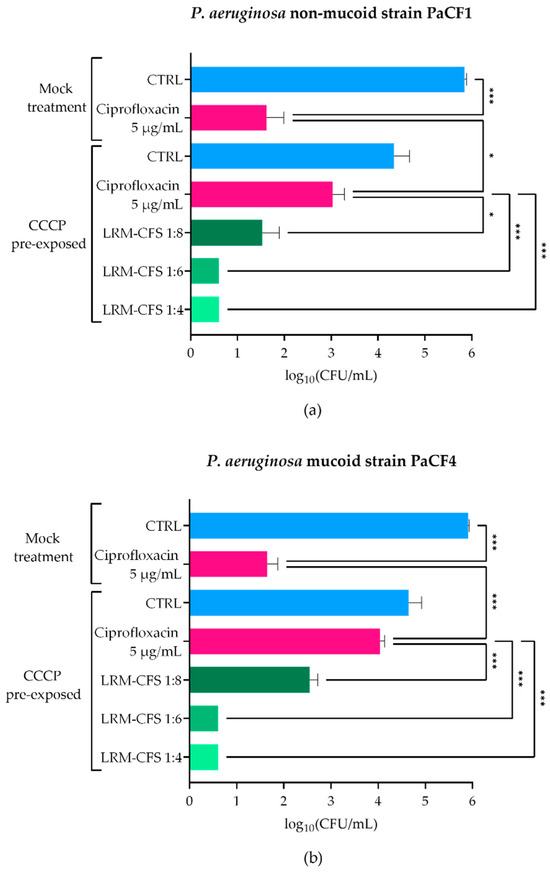 To explore the LRM-CFS therapeutic potential in conditions closely resembling the CF lung, we assessed the anti-persisters activity of LRM-CFS in ASM, which mimics the nutritional environment of the CF lung. To obtain P. aeruginosa persisters, two CF clinical isolates (PaCF1 and PaCF4), exhibiting a non-mucoid and a mucoid phenotype, respectively, were exposed to CCCP for 3 h in LB medium, according to a previously described procedure [20]. The ability of CCCP to induce persistence was confirmed by exposing CCCP-pretreated cultures to ciprofloxacin at very high concentration (5 µg/mL corresponding to 20 x MIC) in ASM. Ciprofloxacin displayed a modest effect against CCCP-pretreated bacteria of both P. aeruginosa strains, whereas it showed a marked bactericidal activity against mock-pretreated bacteria (Figure 1a,b), confirming the acquisition of a ciprofloxacin-tolerant status of CCCP-pretreated bacteria. The bactericidal activity of LRM-CFS against CCCP-generated persisters of P. aeruginosa was then evaluated after 3 h of incubation in ASM. LRM-CFS used at dilutions of 1:6 and 1:4 eradicated persister-enriched cultures to the limit of detection (5 CFU/mL) for both P. aeruginosa strains (PaCF1 and PaCF4) (Figure 1a,b). When tested at the dilution 1:8, LRM-CFS caused a statistically significant decrease in the CFU/mL number of both P. aeruginosa strains, accounting for approximately 1.5-log compared to the number of persister bacteria surviving to ciprofloxacin treatment (Figure 1a,b).