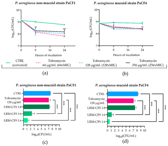 Kinetics of PaCF1 (a) and PaCF4 (b) persister selection in ASM. Bacteria were exposed to tobramycin at concentrations of 64 μg/mL, 128 μg/mL, and 256 μg/mL, and their viability was assessed at 8 h and 24 h time points by CFU counts. Killing activity of LRM-CFS diluted at ratios of 1:4, 1:6, and 1:8 was evaluated against persisters of PaCF1 (c) and PaCF4 (d) in ASM after 24 h of incubation. In (c,d)—CTRL: persisters selected by 24 h tobramycin exposure (as shown in (a,b)) and incubated in ASM in the presence of MRSB pH 4; tobramycin represents persister bacteria further incubated in ASM with tobramycin 128 μg/mL. Results are shown as mean ± standard error of the mean values (n = 4). Statistical significance was evaluated by two-way ANOVA for (a,b) and one-way ANOVA for (c,d), followed by the Tukey–Kramer post hoc test. * p < 0.05, ** p < 0.01, *** p < 0.001.