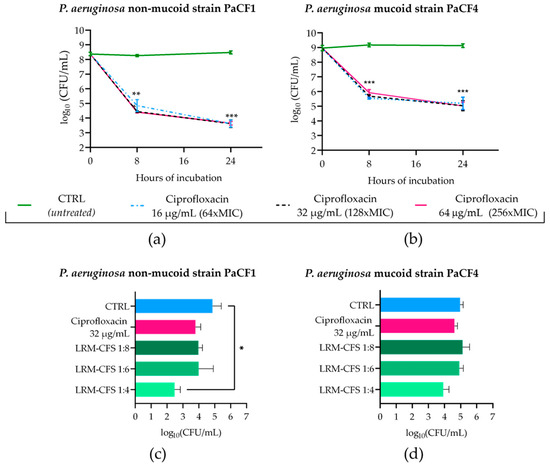 To obtain P. aeruginosa persisters from biofilm in CF-relevant conditions, 48 h old biofilms of PaCF1 and PaCF4 grown in ASM were exposed to concentrations of ciprofloxacin much higher than the MIC value (MIC: 0.25 μg/mL). To this aim, mature biofilms of both strains were incubated with ciprofloxacin at 16, 32, and 64 μg/mL in ASM, and the biofilm-associated viable bacteria count was evaluated after 8 and 24 h of incubation. As shown in Figure 3a,b, ciprofloxacin at all three concentrations tested caused a significant decrease in the CFU number of both P. aeruginosa strains after 8 h of incubation, but the number of surviving bacteria remained almost stable at 24 h. The biphasic killing kinetic was suggestive of the successful selection of ciprofloxacin-tolerant bacteria. The activity of LRM-CFS diluted at 1:4, 1:6, and 1:8 was then tested on bacteria that had been previously exposed to ciprofloxacin at 32 μg/mL (128 x MIC) for 24 h in ASM.