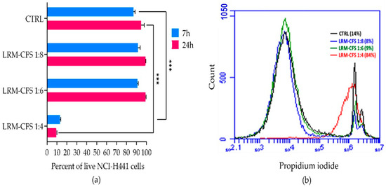 Cytotoxic effect of the LRM-CFS diluted at 1:4, 1:6, and 1:8 in complete RPMI medium was tested in vitro against NCI-H441 cell line grown on the surface of collagen scaffolds in the 3D lung epithelium model. Cells were stained for 5 min with 0.1 μg/mL propidium iodide at room temperature before performing flow cytometric acquisition. (a) Percentage of live NCI-H441 cells after exposure to LRM-CFS for 7 and 24 h. (b) Overlay histogram data from a representative experiment showing PI-positive NCI-H441 percentages (dead cells). CTRL: MRSB diluted at 1:4 in complete RPMI medium. Results are shown as mean ± standard error of the mean values (n = 3). Statistical significance was evaluated by one-Way ANOVA followed by the Tukey–Kramer post hoc test. *** p < 0.001.