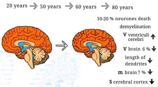Key structural changes in the aging brain; V—volume; S—square; m—mass.