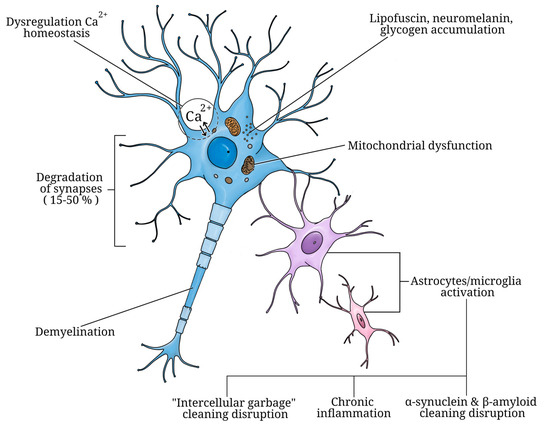 Moderate biochemcal and metabolic changes caused by the changes in the expression of synaptic transmission mediators and their receptors in various parts of the brain are noted [88]. With aging, the state of the mediator systems of the brain changes significantly. One of the most distinctive aging phenomena is the degeneration of the brain’s dopaminergic system, which is directly related to the development of diseases such as Parkinson’s disease (PD) in old age. Disturbances in the activity of the cholinergic mediator system of the brain play one of the main roles in disorders of memory, perception, and other cognitive processes that occur in Alzheimer’s disease (AD). In addition to the above disorders, aging is also characterized by impaired cellular waste removal mechanisms [89], dysregulation of Ca2+ homeostasis [90,91], and mitochondrial neuronal dysfunction [92]. These alterations occur in normal aging and are exacerbated in vulnerable neuronal populations in neurodegenerative diseases [78]. Astrocytes and microglia undergo activation [73,93]. Age-related changes in glial cells can cause persistent chronic inflammation, making the brain more susceptible to neurodegenerative processes [94,95]. The aging process and the emergence of age-associated neurodegenerative conditions coincide with disturbances in lysosomal autophagy processes and the ubiquitin-proteasome clearance system executed by glial cells. Consequently, this leads to the accumulation of so-called “cell garbage” within brain tissue, characterized by the presence of damaged molecules encompassing lipids, proteins, and DNA/RNA [10,96]. Changes in the expression levels of inflammatory mediators by microglial cells contribute to the onset of neurodegenerative pathologies [97]. “Young” microglia exhibit superior efficiency in phagocytizing Aβ [98] and α-synuclein [99] compared to their aged counterparts. Bonham et al. [100] utilized a microglia-specific marker (TMEM119) and a cell type expression profiling tool (CellMapper) to reveal that normal aging induces increased expression of 30 previously unidentified microglia-specific genes in several regions of the healthy human brain as well as those affected by AD.