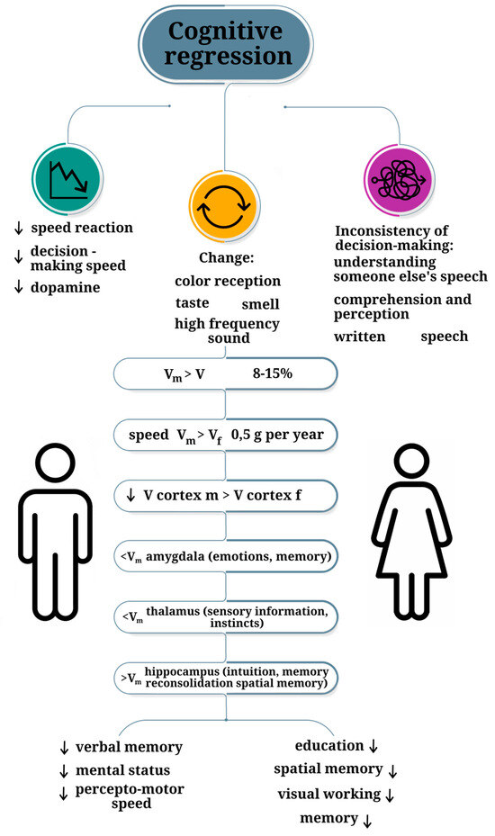 Key age-related brain morph-functional and cognitive transformations, depending on sex; Vm—volume of male structures; Vf—volume of female structures; m—male; f—female.