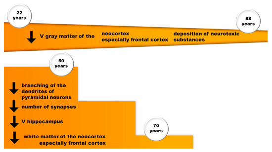 During the aging process, the central nervous system undergoes several irreversible changes affecting biochemical and molecular processes, leading to cellular-level alterations and morpho-anatomical rearrangements within the brain. Key structural changes associated with aging encompass tissue atrophy, functional activity redistribution across brain structures, neurotransmitter expression alterations, and the accumulation of cellular damage [10].