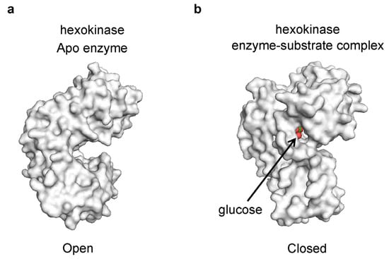 - Bennett, W.S., Jr.; Steitz, T.A. Glucose-induced conformational change in yeast hexokinase. Proc. Natl. Acad. Sci. USA 1978, 75, 4848–4852. [Google Scholar] [CrossRef] [PubMed]