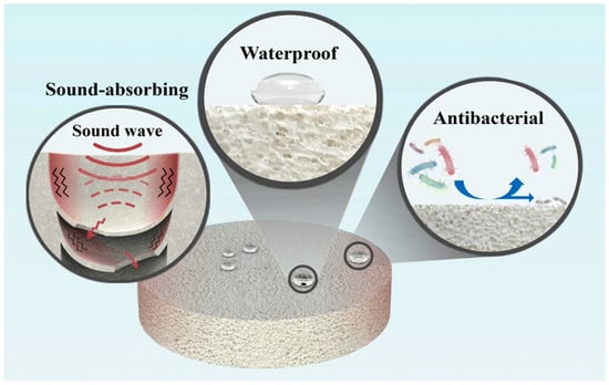 - Zhang, X.; Chen, X.; Min, W.; Liang, G.; Zhang, W.; Yao, S.; Zhong, X. Preparation of Multifunctional Ceramic Foams for Sound Absorption, Waterproofing, and Antibacterial Applications. RSC Adv. 2024, 14, 1009–1017. [Google Scholar] [CrossRef] [PubMed]