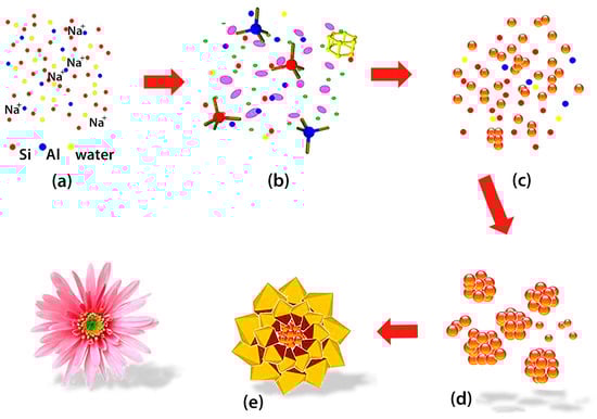 Proposed forming process of the flowerlike Y zeolite. Reprinted with permission from reference []. Copyright 2018 by American Chemical Society. Acknowledgment is given to American Chemical Society. According to Du et al. [], during the initial stage, a high Na+ ion concentration in the system contributes to forming smaller zeolite particles by limiting the polymerization extent. Primary nanosized zeolite crystals are therefore formed at that stage (a–c). At the same time, due to the instability in the hydrothermal synthesis system, the dissociative nanocrystals attract each other and form loose aggregates by self-assembly (c,d). The inner nanocrystals are difficult to grow because of the confined spaces, while the nanocrystals outer can further grow epitaxially and form the oriented “petals” (d,e).