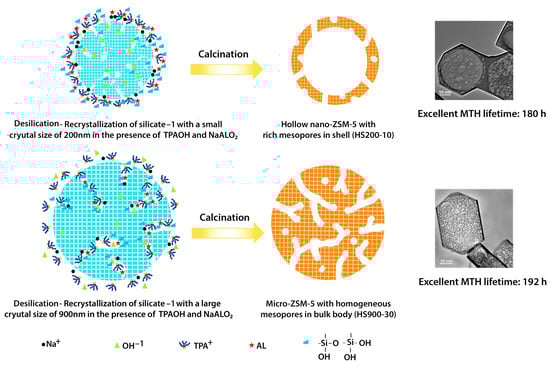 - Ma, Z.; Fu, T.; Wang, Y.; Shao, J.; Ma, Q.; Zhang, C.; Cui, L.; Li, Z. Silicalite-1 Derivational Desilication-Recrystallization to Prepare Hollow Nano-ZSM-5 and Highly Mesoporous Micro-ZSM-5 Catalyst for Methanol to Hydrocarbons. Ind. Eng. Chem. Res. 2019, 58, 2146–2158. [Google Scholar] [CrossRef]