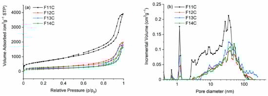 (a) N2 adsorption–desorption isotherms and (b) pore size distribution of SiOC-DC materials pyrolyzed at different temperatures after Cl2 etching. FC11 means that the pyrolysis process was performed at 1100 °C, FC12 at 1200, FC13 at 1300, and F14C at 1400 °C, respectively. Reproduced with permission from M.A. Mazo []. Published by MDPI (Basel, Switzerland), 2023.