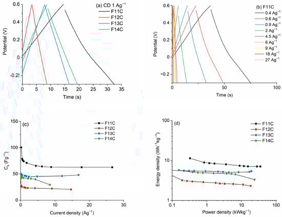 (a) GCD curves of SiOC–DC materials pyrolyzed at different temperatures after Cl2 etching at a current density of 1 Ag−1, (b) GCD curves for the F11C sample, (c) Cs values, and (d) Ragone plots, respectively. FC11 means that the pyrolysis process was performed at 1100 °C, FC12 at 1200, FC13 at 1300, and F14C at 1400 °C, respectively. Reproduced with permission from M.A. Mazo []. Published by MDPI, 2023.