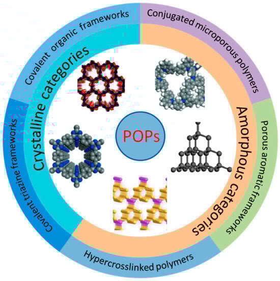 Porous organic polymers (POPs) can be amorphous or crystalline materials with micro- and mesoporous structures, and their unique physical and chemical properties have made it possible for POPs to achieve good behavior in adsorption, catalysis, sensing, production and energy storage, carbon dioxide (CO2) capture, biomedicine, etc. []. Figure 7 shows a partial classification of POPs according to Yang et al. []. Within the amorphous POPs, conjugated microporous polymers (CMPs), porous aromatic frameworks (PAFs), and hypercrosslinked polymers (HPs) can be found, and within the crystalline class, covalent triazine frameworks (CTFs) and covalent organic frameworks (COFs) can be found. The functional groups existing on the surface of POPs can provide reaction sites and have the potential to replace metal-based catalysts. At the same time, the stable structure also guarantees the recovery rate of the catalyst and saves costs. According to Yang et al. [], with existing synthesis technology, achieving stable, uniform and numerous active sites still needs more study. The design of the directional loading of functional groups and active sites, the topological structure and the orderly regulation of the micro-morphology and pore structure are also required in order to improve the catalytic conversion of biomass. In addition, almost all POP materials are synthesized under solvothermal conditions and the requirements for their synthesis environment and equipment make it difficult to achieve large-scale quantities [].