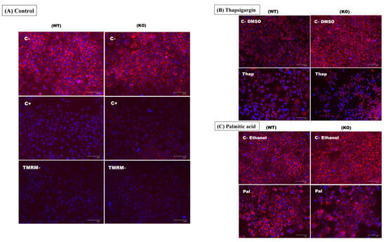 The mitochondrial membrane potential was evaluated using the TMRM assay in the following conditions: (A) Control negative (C−) refers to cells that were not subjected to any treatment. Control positive (C+) refers to cells that were treated with carbonylcyanide 4-(trifluoromethoxy)phenylhydrazone (FCCP), an uncoupler that will reduce the mitochondrial membrane potential and prevent staining by TMRM. TMRM negative (TMRM−) refers to cells that were not stained by TMRM. (B) (C− DMSO) refers to the cells that were treated with DMSO as a control negative and (Thap) refers to the cells that were treated with 6.25 nM thapsigargin. (C) (C− Ethanol) refers to the cells that were treated with ethanol as a control negative and (Pal) refers to the cells that were treated with 300 µM palmitic acid. (D) (C− DMSO) refers to the cells that were treated with DMSO as a control negative, (Tun 1 µg) refers to the cells that were treated with 1 µg/mL tunicamycin, and (Tun 20 µg) refers to the cells that were treated with 20 µg/mL tunicamycin. (A–D) The red-fluorescent probe (TMRM) localizes in mitochondria and detects mitochondrial membrane depolarization. The blue-fluorescent probe (NucBlue) detects the cellular nucleus. (E) The fluorescent integrated density of the red probe in the aforementioned conditions was evaluated through fluorescent microscopy, with the resulting data subsequently analyzed using the ImageJ (Fiji) software version windows 64-bit Java 8. (F) The fluorescent intensity of TMRM was assessed using a microplate fluorimeter at excitation/emission of 548/575 nm to corroborate the microscopic visualization results. WT: normal mouse hepatocyte AML12 cells, KO: TXNDC5-deficient AML12 cells. The statistical analyses were conducted in accordance with the Mann–Whitney U-test, with the following significance levels: * p < 0.05, ** p < 0.01.