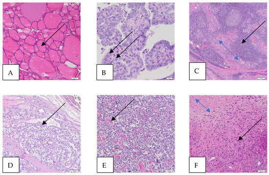 Microscopic images of thyroid and thyroid cancers (hematoxylin and eosin staining—HE). (A) Normal thyroid, magnification 100×, scale bar 100 μm (colloid in a follicle, arrow). The thyroid gland consists of many follicles lined by many thyrocytes (follicular cells) and the colloid in the center. The parafollicular cells, called C cells, are sparse and scattered and lie between the follicles (not shown). (B) Papillary thyroid carcinoma (PTC), magnification 400×, scale bar 20 μm (intranuclear pseudoinclusions, arrows). The papillae are lined by follicular cells with changes in size and shape, irregularities of the nuclear membrane (intranuclear grooves and intranuclear pseudoinclusions), and chromatin characteristics. The classic (conventional) subtype of PTC (foto) is the most histologic subtype of this cancer. (C) Hashimoto’s thyroiditis (HT), magnification 100×, scale bar 100 μm (atrophic follicles, double-headed blue arrow; lymphocytic infiltration, black arrow). HT affects the thyroid gland, causing an increased number of lymphocytes that infiltrate the organ and form primary and secondary lymphoid follicles, which lead to the destruction of thyroid follicles and, thus, a reduction in the amount of colloid, which ultimately causes a deficiency of thyroid hormones. (D) Follicular thyroid carcinoma (FTC), magnification 200×, scale bar 50 μm (vascular invasion—the intravascular polypoid tumor is covered by endothelium, arrow). (E) Medullary thyroid carcinoma (MTC), magnification 200×, scale bar 50 μm (amyloid deposits in the stroma, arrow). MTC is a malignant tumor derived from the parafollicular C cells of the thyroid gland. (F) Anaplastic thyroid carcinoma (ATC), magnification, 200×, scale bar 50 μm (cancer cells, black arrow; cancer necrotic tissue, double-headed arrow). ATC is a highly aggressive thyroid tumor that contains undifferentiated cells and may have focal features of thyroid follicular differentiation. Many pleomorphic cells are spindle, and some have epithelioid shapes.