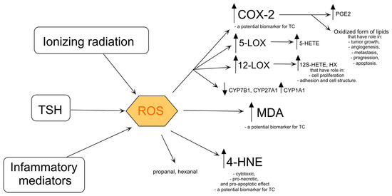 Oxidative stress (OS) alters the composition of lipids, proteins, and nucleic acids, which can lead to the disturbance of homeostasis. Oxidized lipid products are formed as oxylipins in nonspecific reactions supported by OS and as a result of enzymatic reactions catalyzed by cyclooxygenases (COX), lipoxygenases (LOX), and cytochrome p450 (CYP450). The thyroid gland is an organ in which reactive oxygen species (ROS) are constantly formed under the influence of TSH (Figure 2). The increase in ROS levels determines the subsequent stages of the cancer [38,39]. Increased ROS levels, which are characteristic of PTC, are associated with aggressiveness. This could indicate the involvement of ROS in the development and progression of the disease [40,41]. ROS are actively involved in lipid peroxidation. The increase in lipid peroxidation may be due to the fact that the enzymes that perform peroxide sequestration cannot keep up with the high peroxide production [39]. Lipid peroxides are unstable compounds that rapidly decompose into 4-hydroxy-2-nonenal (4-HNE), malondialdehyde (MDA), propanal, and hexanal (Figure 2) [42]. Lipid peroxidation is higher in patients diagnosed with malignant tumors, including PTC [38,39], MTC [39], and FTC [39], than in the HC group. Elevated levels of MDA are observed in PTC and FTC [38,43] and PTC tissues [38,43] and in the sera of MTC patients [44]. PTC patients with metastases and angioinvasion are differentiated from patients with PTC without these features by the elevated MDA concentration [45]. The positive correlation between the MDA concentration and the lipid profile in the sera of PTC patients indicates the risk of a dysregulation of the lipid level, which in turn leads to the formation of metastases [46]. Furthermore, Stanley et al. observed an elevated MDA concentration in PTC patients unrelated to HT [39].