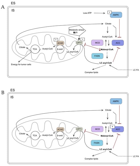 Mechanism of fatty acid uptake and metabolism (A) in TC cells and (B) in normal cells. ↓ Malonyl-CoA—decrease of Malonyl-CoA. TCA—tricarboxylic acid cycle, ACAD—acyl-CoA dehydrogenase, ACC—acetyl-CoA-carboxylase, AMPK—adenosine monophosphate–activated protein, β-oxid—β-oxidation, CPT1—carnitine palmitoyl transferase 1, ES—extracellular space, FASN—fatty acid synthase, glc—glucose, IS—intracellular space, MCD—malonyl-CoA decarboxylase, LC FA—long-chain fatty acid, LC acyl-CoA—long-chain acyl-CoA. The arrows depict the metabolic flux of fatty acids and related pathways. (A) Low ATP activates AMPK inhibiting ACC to reduce malonyl-CoA and glucose deprivation stimulate CPT1, shifting metabolism towards fatty acid oxidation for tumor cell energy. (B) ACC is activated, increasing malonyl-CoA levels and promoting lipid synthesis via FASN, with regulation by MCD.