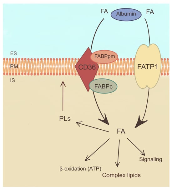 Mechanism of fatty acid uptake and metabolism. ES—extracellular space, FABPpm—plasma membrane fatty acid binding protein, FABPc—cellular fatty acid binding protein, FATP1—fatty acid transport protein 1, FA—fatty acid, PLs—phospholipids, PM—plasma membrane. The arrows indicate directions of fatty acid transport and their involvement in metabolic reactions.