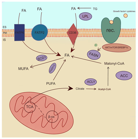 The mechanisms underlying FA uptake in PTC involve several transporters and receptors that facilitate the entry of FAs into the cancer cells [80]. One of the key proteins involved in FA uptake is CD36, a transmembrane receptor that binds and internalizes FAs (Figure 4). The expression of CD36 has been found to be increased in PTC, possibly contributing to increased uptake of FAs [79]. Additionally, FA transport proteins (FATPs) have been associated with PTC as they facilitate the transport of FAs across cell membranes (Figure 4) [27].