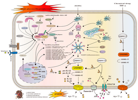 Schematic illustration of the pyroptosis pathway associated with DKD. The protein molecules HMGB1, mTOR, ALPK1, AMPK/STRT1, and DUSP1/P38MAPK can activate downstream NF-κB; lncRNA-038323/miR-324-3P; lncRNA-Gm4919 also activate downstream NF-κB; ER stress can activate NF-κB; IκBα and TRIM29 interact, and TRIM29 E3 ligase leads to IκBα duration and activation of NF-κB; TLR4 activates NF-κB through Myd88; TGFβ1 activates NF-κB through the TGFR pathway. Subsequently, activated NF-κB is translocated to the nucleus and then transcriptionally regulates NLRP3, GSDMD, IL-1β, and IL-18, which then acts on NLRP3 to activate caspase-1 to shear the GSDMD to form a pore for GSDMD-NTs, leading to the efflux of the inflammatory factors IL-1β and IL-18 and the influx of H2O and the formation of cellular pyroptosis. In addition, IL-1β and IL-18, which are transcribed by NF-κB, can directly act on pro-IL-18 and pro-IL-1β to form IL-1β and IL-18, which are released into the extracellular space. FOXM1 inhibits NF-κB activation by transcriptional activation of SIRT4, and DDR1 may activate the NF-κB/NLRP3 pathway. Nuclear transcriptional IncRNAs and miRs target TXNIP and NLRP3, the former including the Inc-PWARSN/miR-372-3P and Inc-ANRIL/miR-497 pathways; the latter encompassing lncRNA-PVT1/miR-20a-5p, lncRNA-HOTAIR/miR-22, lncRNA-LINC00339/miR-3P, lncRNA-Kcnq1ot1/.miR-204-5p/BRCC3, lncRNA-ANRIL5/miR-12-5p, lncRNA-XIST/miR-223-3p, lncRNA-XIST/miR-133a-3p/IL6ST, lncRNA-MALAT1/miR-2355-3p, lncRNA-MALAT1/miR-135b-5p, lncRNA-MALAT1/miR-30c, and lncRNA-NEAT1/miR-34c, a total of 11 pathways, and subsequent activation of caspase-1 to shear GSDMD, the pore formation, leading to cellular pyroptosis. In addition, caspase-1 shears pro-IL-1 and βpro-IL-18 to produce IL-1β and IL-18 inflammatory factors. ROS inhibits TRX/ TXNIP, causing TXNIP to stimulate NLRP3 to activate caspase-1 to shear GSDMD to form a pore for GSDMD-NTs, leading to the efflux of inflammatory factors to form cellular pyroptosis; ROS can act on p38MAPK to activate NF-κB, as well as directly activate NF-κB. NOX4 generates ROS to inhibit TRX/TXNIP; ROS can act directly on mitochondria, leading to mitochondrial damage generating mtROS and mtDNA, which act on TXNIP and NLRP3 to activate caspase-1; Syk and Ripk3 can act directly on NLRP3 to activate caspase-1 activation of caspase-1, followed by shear GSDMD involved in subsequent cellular pyroptosis. Activated caspase-11 shears GSDMD involved in the ensuing cellular focal death. In addition, caspase-11 acts on Pannexin-1 to efflux ATP, and the effluxed ATP opens the P2X4 (7) R channel to allow K+ efflux and Ca2+Na+ endocytosis. Chemical drugs and TNF-α activate caspase-3 to shear GSDME and form GSDME-NTs pores in the cell membrane, leading to cellular pyroptosis.