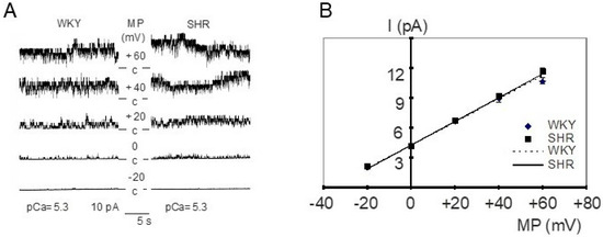 - England, S.K.; Wooldridge, T.A.; Stekiel, W.J.; Rusch, N.J. Enhanced single-channel K+ current in arterial membranes from genetically hypertensive rats. Am. J. Physiol. 1993, 264, H1337–H1345. [Google Scholar] [CrossRef] [PubMed]