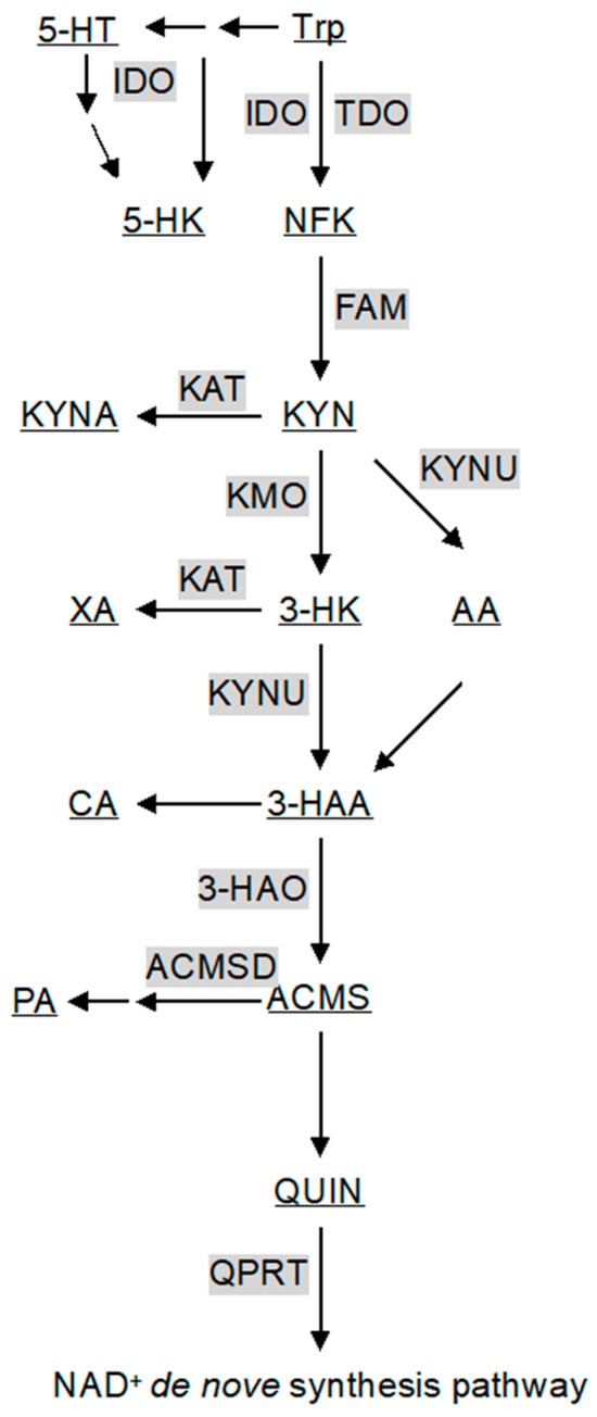 | 1 | Trp | TDO | NFK | Trp, glucocorticoid, heme | 3-HK, 3-HAA, NAD(P)H |