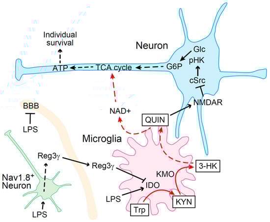 - Sugisawa, E.; Kondo, T.; Kumagai, Y.; Kato, H.; Takayama, Y.; Isohashi, K.; Shimosegawa, E.; Takemura, N.; Hayashi, Y.; Sasaki, T.; et al. Nociceptor-derived Reg3γ prevents endotoxic death by targeting kynurenine pathway in microglia. Cell Rep. 2022, 38, 110462. [Google Scholar] [CrossRef] [PubMed]