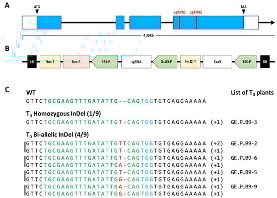 Detection of OsPUB9 gene-edited lines. (A) Structure of the OsPUB9 gene and selection of the target region of OsPUB9 for the CRISPR RGEN tool. Blue box indicates the exon region, and white box indicates the 5′-UTR and 3′-UTR, respectively. (B) Construction of the Ti-plasmid vector of the sgRNA region for CRISPR/Cas9-mediated mutagenesis of OsPUB9 genes in rice. LB, left border; RB, right border; Nos-T, nopaline synthase terminator; Bas-R, basta resistance gene; sgRNA, single guide RNA of OsPUB9; OsU3-P, Oryza sativa U3 promoter driven sgRNA cassette; and Cas9, human codon-optimized Cas9 expressing cassette. (C) Identification of mutation genotypes in the OsPUB9 gene generated by CRISPR/Cas9 technology through NGS analysis in WT and T0 plants. Green indicates the target sequence, and blue indicates the PAM region in WT. InDel sequence of the target locus is shown in red. Insertion is indicated by an insertion of nucleotides such as “T” or “G”. The plus (+) signs indicate the number of nucleotides inserted at the target sites, respectively. WT, wild type sequence with no mutations.