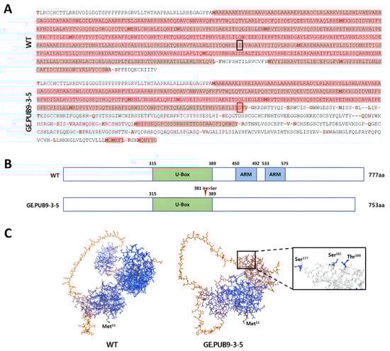 Based on the previously analyzed amino acid sequence, in order to determine whether changes in bases in OsPUB9 gene-edited null line causes any changes in OsPUB9 protein structure, we examined the OsPUB9 domain structure and key functional residues using the protein modeling program. In the GE.PUB9-3-5 line where early stop codon and many ORFs occurred, isoleucine was changed to serine in the 381st amino acid sequence of the OsPUB9 gene, which plays an important role in OsPUB9 gene domain structure. Accordingly, the subsequent peptide chains were connected with the ARM repeat domain in the wild-type OsPUB9, whereas in OsPUB9 of GE.PUB9-3-5 they were not connected to the ARM repeat domain (Figure 2B).