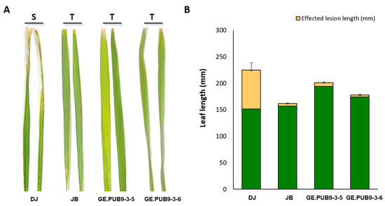 Phenotype and lesion length of bacteria blight (race K2) inoculation in Dongjin (DJ) and Jinbaek (JB), T2 OsPUB9 gene-edited null lines. (A) Phenotypic reaction of plants. (B) Average lesion length of leaf bacterial leaf blight symptoms measured in mm taken at 14 days post inoculation.