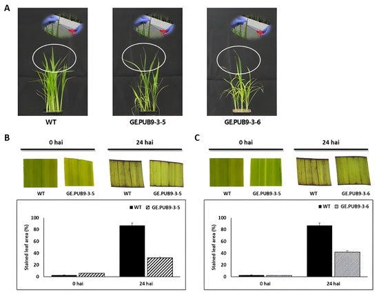 H2O2 detection with DAB staining in leaf segments of WT and OsPUB9 gene-edited null lines (GE.PUB9-3-5 and GE.PUB9-3-6) in response to bacterial blight stress. (A) Phenotype of flag leaves during ripening phase used in H2O2 detection with DAB staining. (B) Histochemical detection of H2O2 after 24 h post-inoculation and quantitative accumulation of leaf areas stained in GE.PUB9-3-5. (C) Histochemical detection of H2O2 after 24 h post-inoculation and quantitative accumulation of leaf areas stained in GE.PUB9-3-6. Three replicates were used, and data are shown with SE. hai, hours after inoculation.