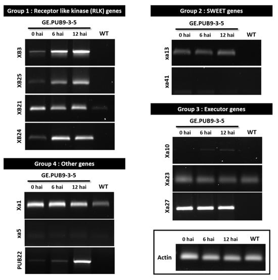 We aimed to identify the expression of R genes related to resistance response to bacterial blight stress. Extensive genetic studies on resistance to bacterial blight stress have been conducted over the last 20 years. More than 40 resistance (R) genes conferring host resistance to various strains of Xoo have been identified and 11 of them were cloned [36]. These R genes can be classified into four groups based on their encoding proteins, including receptor-like kinase (RLK) genes (Xa21, Xa3/Xa26 and Xa4), sugar will eventually be exported transporter (SWEET) genes (xa13, xa25 and xa41), executor genes (Xa10, Xa23 and Xa27) and other types of genes (Xa1 and xa5) [36]. We have tested eleven R genes and one PUB gene to check their expression with the GE.PUB9 gene-edited rice line. These genes used for gene expression comparison each consist of four RLK genes (XB3, XB25, XB21, and XB24), two SWEET genes (xa14 and xa41), three executor genes (Xa10, Xa24, and Xa27), and three other genes (Xa1, xa5, and PUB22).