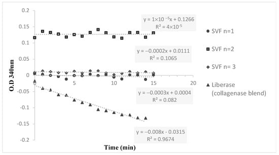 The detection of collagenase residual in the three SVF samples was carried out using the Collagenase Activity test kit for in-process control (Cat. No. 08074461001, Roche Diagnostics, Rotkreuz, Switzerland). The kit included the assessment of a five-point calibration curve for the enzymatic activity quantification of Collagenase I and Collagenase II in Liberase blends. The hydrolysis kinetics of the chromogenic substrate FALGPA, a labeled tetrapeptide resembling the primary structure of collagen, was measured with Liberase standard; the three SVF samples and collagenase-free blend were used as a negative control. Using the multiwall plate reader, the absorbances at 340 nm of 15 data points (1 measure per minute) were recorded. The maximal reaction velocities (Vmax (ΔAbs/min), linear slope) and enzymatic activity concentration were determined.