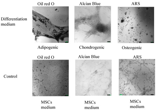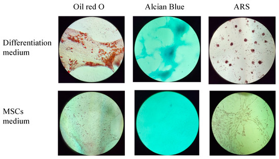 Figure 5, upper panels). The cultured SVF that was treated with differentiation media and stained with Oil Red O, Alcian Blue, and Alizarin Red S (ARS) were positive for adipogenic, chondrogenic, and osteogenic differentiation, respectively. In addition, low positive staining was also detected for the control cells that were treated with MSC maintenance medium (