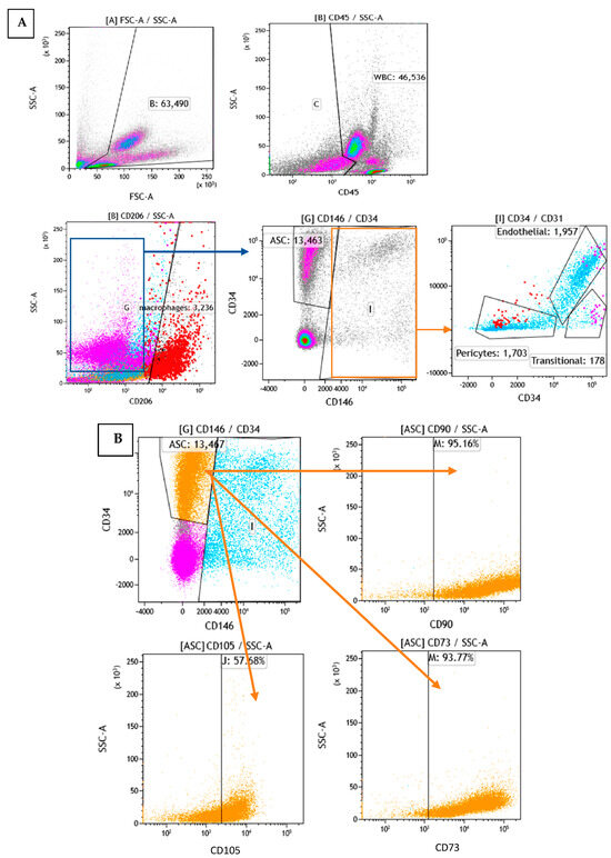 The immunophenotyping of freshly isolated SVF was performed by flow cytometry using a BD Canto II cytometer with 3 lasers (blue (488 nm), red (633 nm), and violet (405 nm), BD, Franklin Lakes, NJ, USA). The removal of erythrocytes was carried out using RBC lysis buffer (BD FACS lysing solution, 349202, USA). The following monoclonal antibodies (MAbs), conjugated to various fluorochromes, were used in single-cell suspensions of SVF to differentiate between the different cell populations: CD34, CD31, CD106, CD206, CD146, CD73, CD90, CD45, CD105, CD235a, CD44, CD34, CD29, CD326, and HLA-DR (antibodies were purchased from BD Biosciences). To assess the SVF cell count and viability, TrueCount beads and 7-amino-actinomycin (7-AAD) were used (BD Biosciences, Franklin Lakes, NJ, USA).
