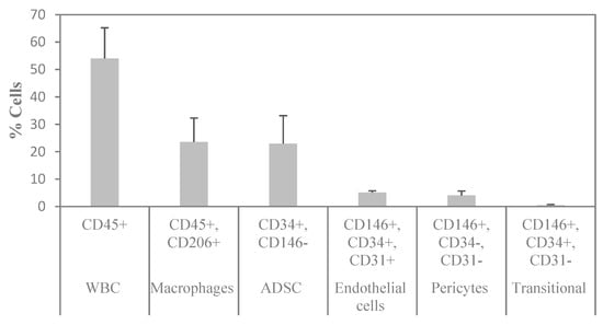 To determine the cellular composition of SVF, flow cytometry analysis was performed to identify the different cell populations based on their surface expression markers. After RBC lysis, most of the characterized cells were either positive for CD45 or CD34, which are markers for WBC and stem cells, respectively. To assess the cell identity and frequency, a combination of CD31 (endothelial marker) and CD146 (perivascular marker) was tested.