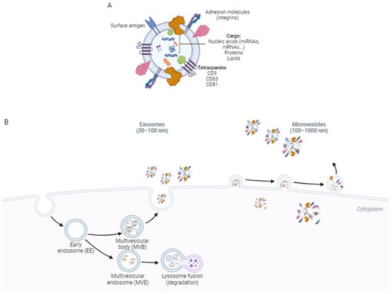 EV characteristics and biogenesis pathway. (A) Graphical representation of the composition and structure of an EV (B) Biogenesis pathway. Various components and cargoes destined for EVs are distributed throughout the cytoplasm and membranes. Specific elements and cargoes earmarked for future EVs are gathered and recruited. The recruited elements aid in membrane bending and invagination. Membrane scission occurs, resulting in the formation of either microvesicles or intraluminal vesicles. The multivesicular body (MVB) is transported to the plasma membrane. The MVB fuses with the plasma membrane, liberating the intraluminal vesicles (now known as exosomes) into the extracellular space. Figure created using the tool at https://www.biorender.com/, accessed on 15 March 2024.